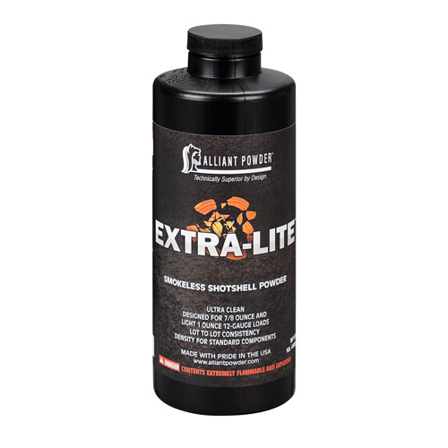 Our new shotshell propellant provides less cost, less recoil and less headaches for those 12 gauge shooters transitioning from 1 1/8 ounce to 7/8 and 1 ounce loads. We understand that many shooters are looking for a powder that will have a density that allows use of standard components (wads and cases). These same shooters also want pressure levels that guarantee complete combustion across a broad temperature range while still being clean burning. Well… now they have it with Extra-Lite from Alliant Powder®.