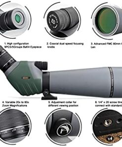 - Variable 20x to 60x zoom magnification allows you to see a wide field of view at low power and enlarge details with higher performance. Perfect for target shooting, archery, hunting, bird watching, wildlife watching, hiking, camping, landscape, outdoor sports, astronomical observation, etc.